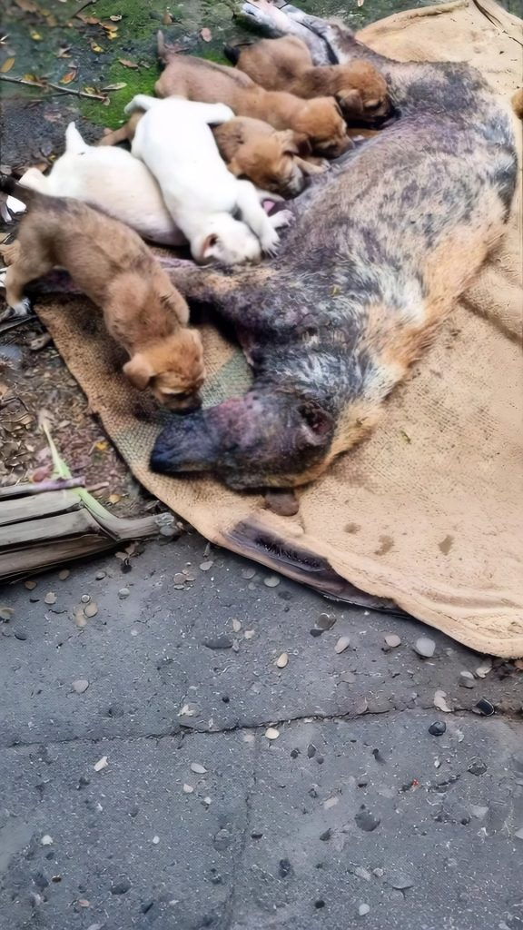 In a quiet, overlooked part of a small town, where few people ever stopped to look, a mother dog lay curled against the cold pavement. Around her were scattered trash bags, broken cardboard, and the forgotten remains of daily life. Pressed close to her body were her newborn puppies, barely days old, relying on her for warmth and protection.