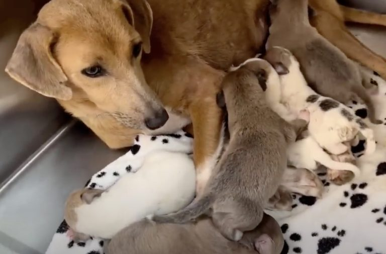 Vera had given birth to ten puppies. But help had come too late for three of them. Their tiny bodies were already still. The remaining puppies were barely alive—cold, weak, and struggling to breathe. Despite her exhaustion and starvation, Vera refused to move. She pulled the surviving puppies closer, pressing them against her chest, guarding them with the last of her strength.