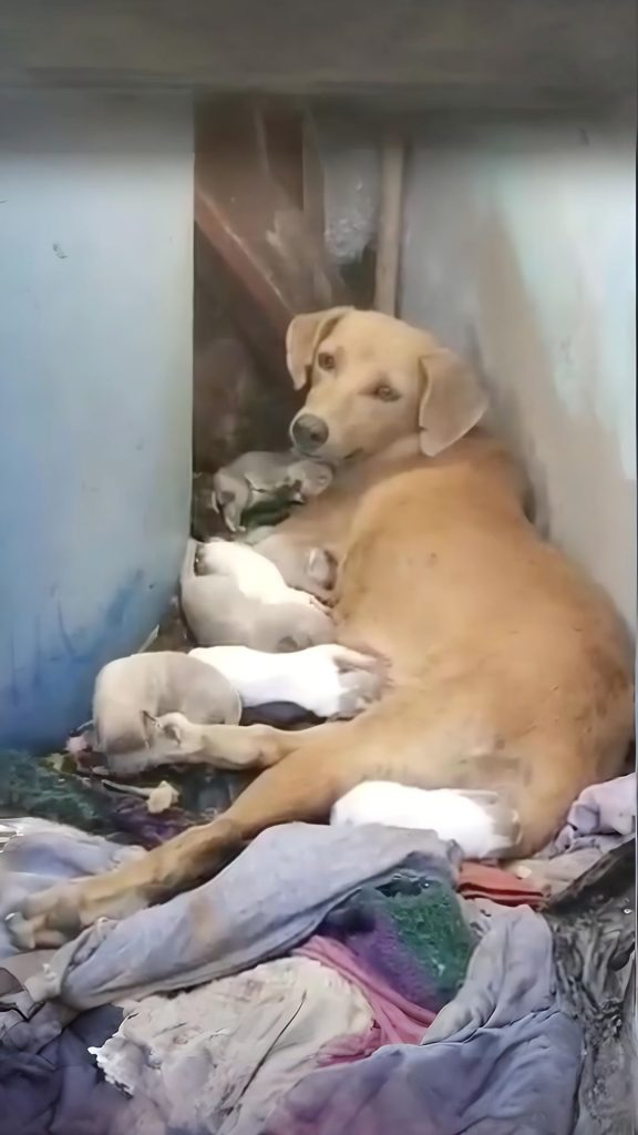 Vera had given birth to ten puppies. But help had come too late for three of them. Their tiny bodies were already still. The remaining puppies were barely alive—cold, weak, and struggling to breathe. Despite her exhaustion and starvation, Vera refused to move. She pulled the surviving puppies closer, pressing them against her chest, guarding them with the last of her strength.