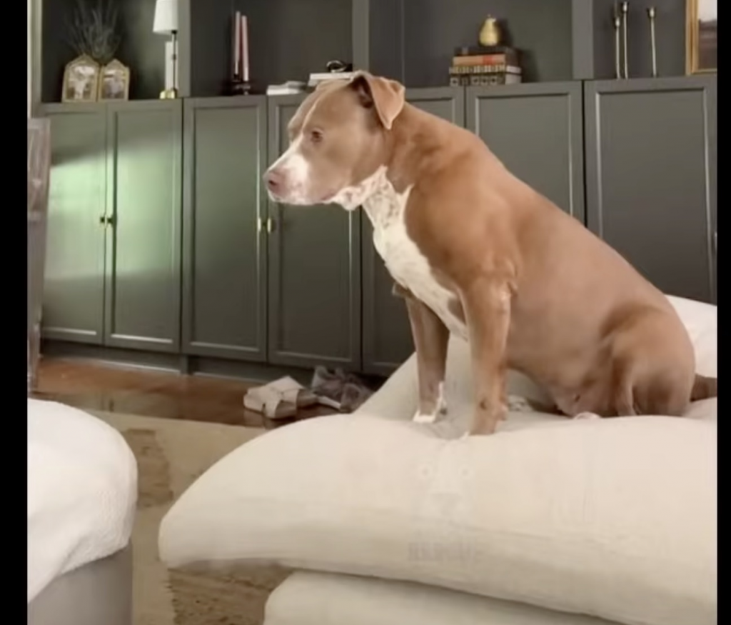 As the sky rumbled, she walked over and curled up near her humans. The noise continued, but she stayed calm, comforted by the presence she trusted.