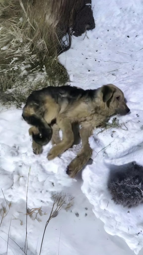 A dog lay half-hidden in the snow, his body curled in on itself as if trying to disappear. His legs shook uncontrollably. Each breath was short, strained, as though the air itself was slipping away. Ice crusted his fur, locking it into stiff, jagged clumps. He made no sound. He didn’t struggle. He simply held on.