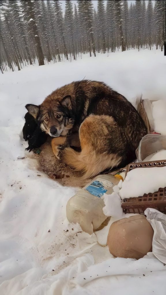 Curled into a shallow pocket in the snow lay a dog barely strong enough to lift her head. Her fur was stiff with ice. Her body trembled uncontrollably. Each breath came shallow and slow.