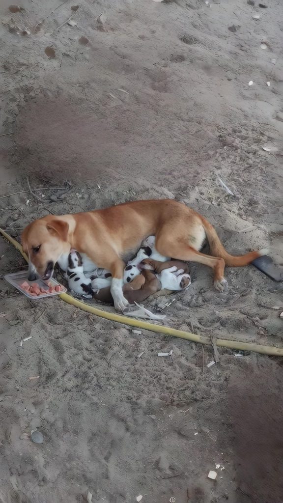 Her body was failing under the heat. Dehydration made each breath shallow. Her milk was running low. Still, she adjusted her position again and again, placing herself between her puppies and the burning asphalt, absorbing the heat so they wouldn’t have to.