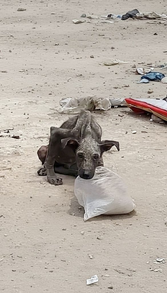 Curled beside a pile of roadside garbage, his body was so thin and motionless that people mistook him for waste. Bones pressed sharply against his skin. Large areas of fur were gone, exposing inflamed, wounded flesh beneath. From a distance, many assumed he had already died. Up close, the truth was just as painful—he was alive, but barely holding on.