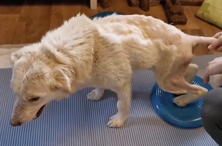 Once he was lifted from the ground and wrapped in warmth, the reality of his condition slowly revealed itself. His body resisted movement. His hind legs trembled with effort. Standing wasn’t just difficult—it was painful.