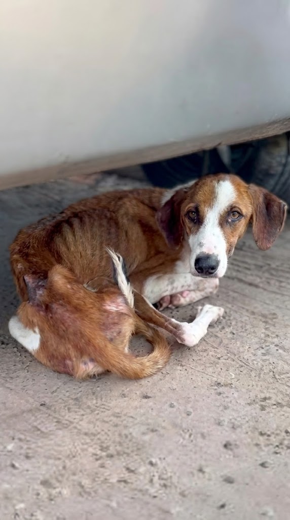 Her frame was painfully thin, her fur rough and tangled from neglect. When she slowly lifted her head, her eyes met ours. There was no aggression. No panic. Just a deep, bone-tired weariness—the kind that comes from being forgotten for far too long.