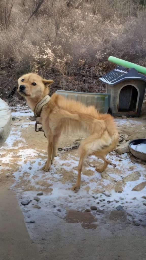 Donghee’s body told a quiet story of neglect. She was painfully thin, her frame trembling with more than just the cold. Hunger and fatigue had drained her strength over time. Her coat was rough and patchy, unable to shield her from the freezing temperatures. Every bone seemed visible beneath her skin. But what lingered most in the minds of those who later heard her story were her eyes—still, distant, and resigned.