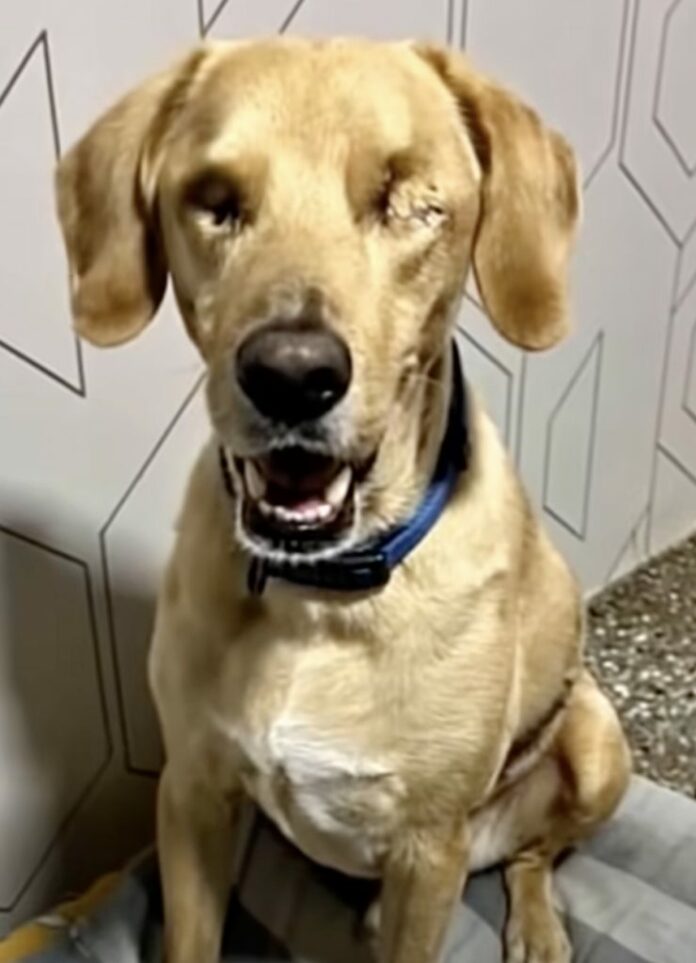 As they approached, the truth surfaced gently, painfully. Benki didn’t turn his head. His eyes didn’t follow movement. He couldn’t see them at all. One hind leg was missing, and the rest of his body bore signs of long-term neglect—marks left not by accident, but by time.
