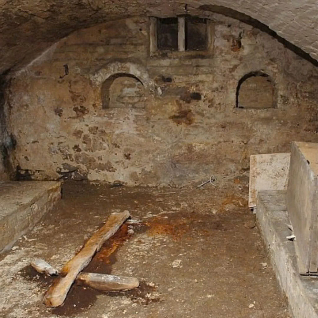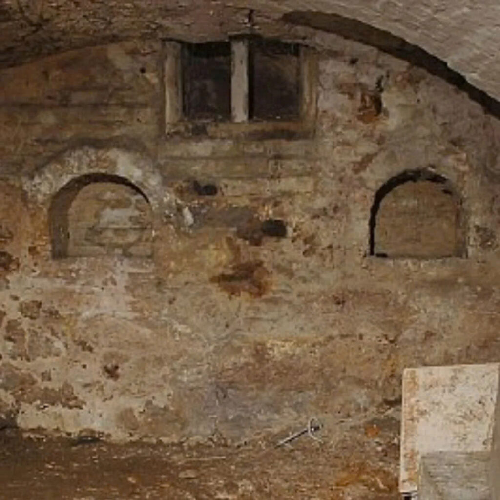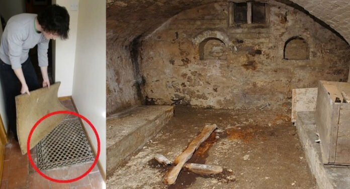 Within the cellar stood a decayed wooden cross, hinting at the room’s sacred past. Delving deeper, they discovered an ancient chest filled with relics, including aged newspapers and glass bottles from the 1930s. Hooks suspended from the ceiling suggested a history of meat preservation, while brick benches along the walls created a church-like ambiance.