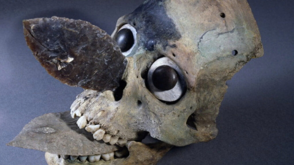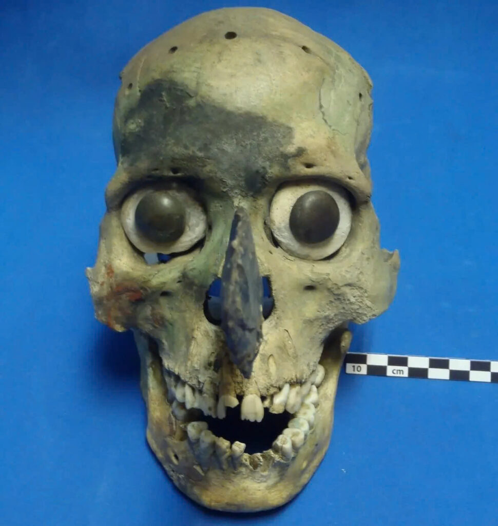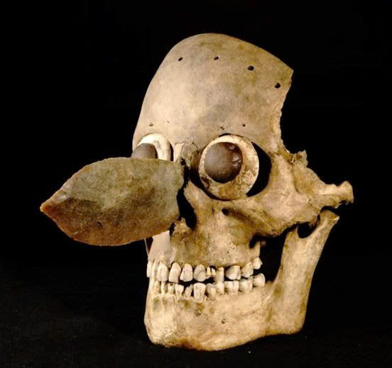 The masks were described as decorative headpieces made from human skulls, designed to be worn over the face or integrated into headdresses. Modifications included the removal of the back cranium, the application of dyes, and the insertion of decorative elements in the eye sockets and nasal cavities.