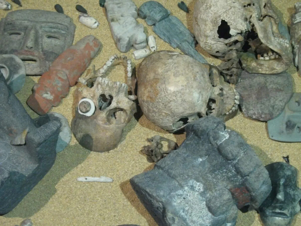 The Templo Mayor, revered as the religious and political nucleus of Tenochtitlán, served as the heart of the Aztec Empire in the 15th century AD. Dedicated to Huitzilopochtli, the god of war and the sun, this temple is a focal point of evidence revealing the prevalence of human ritual sacrifice—an integral aspect of Aztec spirituality. Practices included beheading, heart extraction, and ceremonial combat, making the discovery of the skull masks particularly striking even within the context of ritual sacrifice.
