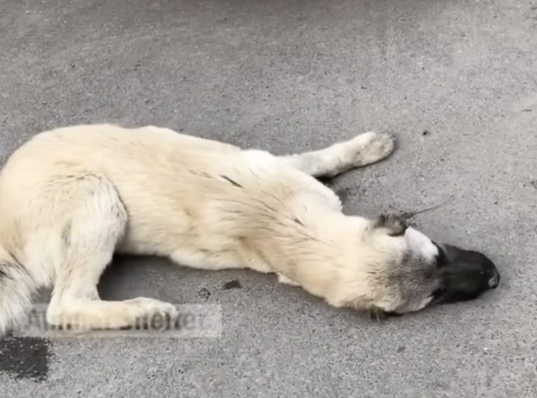 The sun crept higher, warming the asphalt beneath his paws. There was no shade. No water. No safe place to lie down. His breaths were shallow, his gaze unfocused. Around his neck lingered a faint mark—evidence that once, he had belonged somewhere.